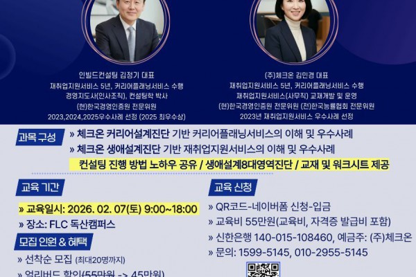 공공기관 면접 전문가 대거 참여... 사람성장학교 오지안 대표 등 교육 현장 리더들 주목고용노동부 등록 과정으로 운영되는 ‘제6회 체크온 채용전문면접관 자격과정’이 지난 1월 17일, 성황리에 막을 내렸다. 이번 과정은 최근 기업 및 공공기관에서 요구하는 공정 채용 실무 역량 강화를 위해 하루 9시간의 강도 높은 집중 교육으로 진행됐다.이번 교육은 변화하는..
